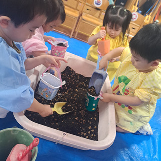 夏休み中、持ち帰った植物を育てようとのお話がありました。6月中旬頃に、年少さんは“ふうせんかずら”、年中さんは“あさがお”、年長さんは“バジルorシソ”の種を蒔き、芽が出て少し大きくなってから持ち帰りました。自分の植物に水をあげるのはみんなのお仕事!そして、観察をしながら大切に育ててね!