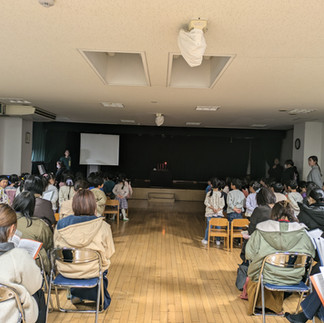 今回はアドベント集会1回目であったので、舞台の上にあるアドベントクランツ(ろうそく)に1本火が灯りました。アドベント集会が進むごとに1本ずつ明かりは増えていき、4本灯るとクリスマスです。