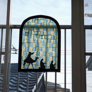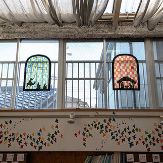 園内のクリスマスの飾りも増え、年長さんが作ったステンドグラスが絵本コーナーや階段に飾られました!